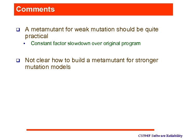 Comments q A metamutant for weak mutation should be quite practical • q Constant factor slowdown over original program Not clear how to build a metamutant for stronger mutation models CS 590 F Software Reliability