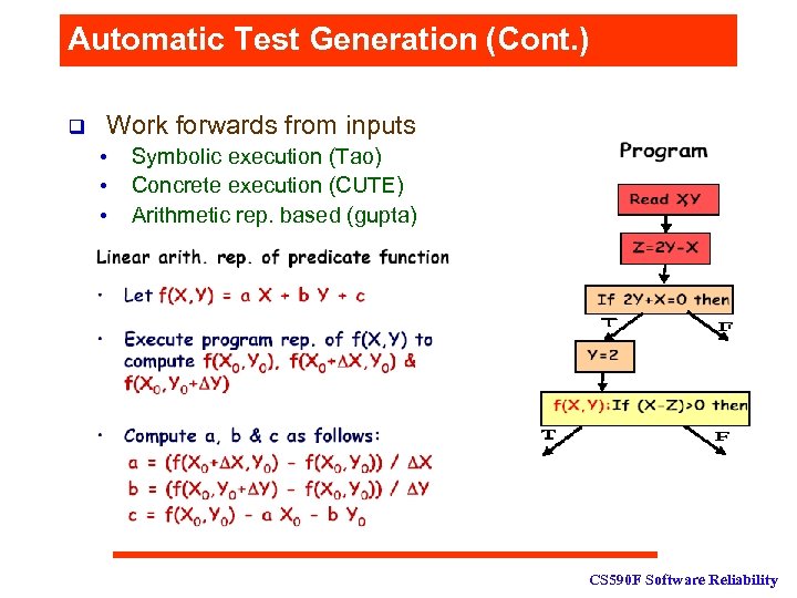Automatic Test Generation (Cont. ) q Work forwards from inputs • • • Symbolic execution (Tao) Concrete execution (CUTE) Arithmetic rep. based (gupta) CS 590 F Software Reliability