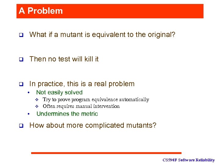 A Problem q What if a mutant is equivalent to the original? q Then no test will kill it q In practice, this is a real problem • Not easily solved v v • q Try to prove program equivalence automatically Often requires manual intervention Undermines the metric How about more complicated mutants? CS 590 F Software Reliability