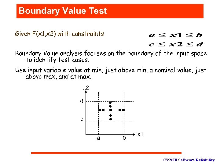 Boundary Value Test Given F(x 1, x 2) with constraints Boundary Value analysis focuses on the boundary of the input space to identify test cases. Use input variable value at min, just above min, a nominal value, just above max, and at max. x 2 d c a b x 1 CS 590 F Software Reliability