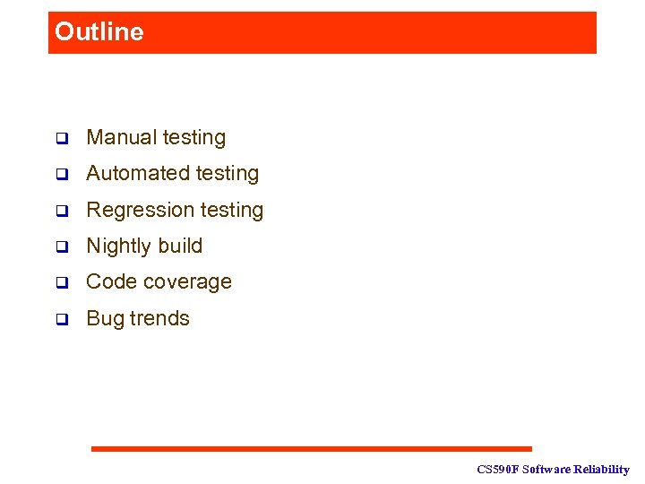 Outline q Manual testing q Automated testing q Regression testing q Nightly build q Code coverage q Bug trends CS 590 F Software Reliability
