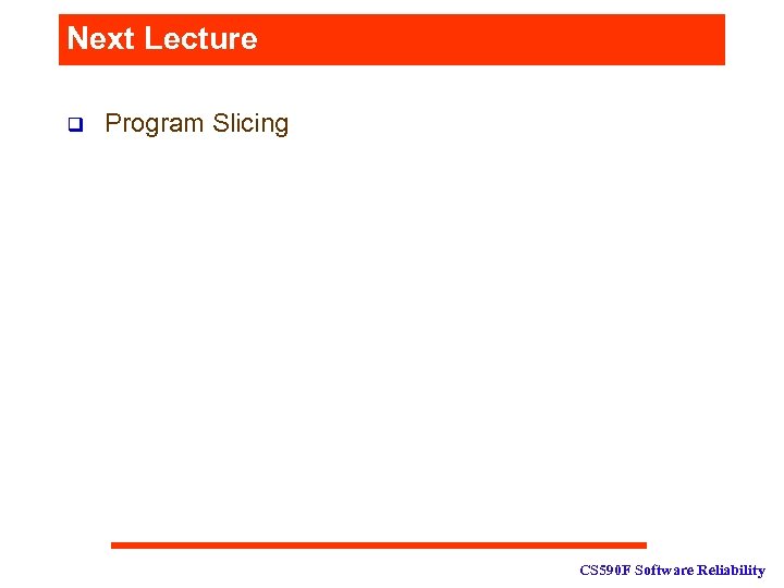 Next Lecture q Program Slicing CS 590 F Software Reliability