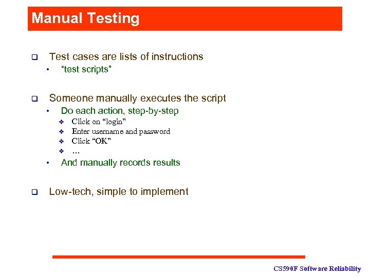 Manual Testing q Manual testing is very widespread • q Probably not dominant, but very, very common Why? Because • Some tests can’t be automated v • Usability testing Some tests shouldn’t be automated v Not worth the cost CS 590 F Software Reliability