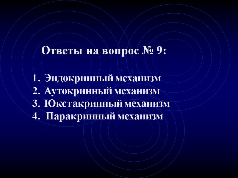 Ответы на вопрос № 9: Эндокринный механизм Аутокринный механизм Юкстакринный механизм 4. Паракринный механизм