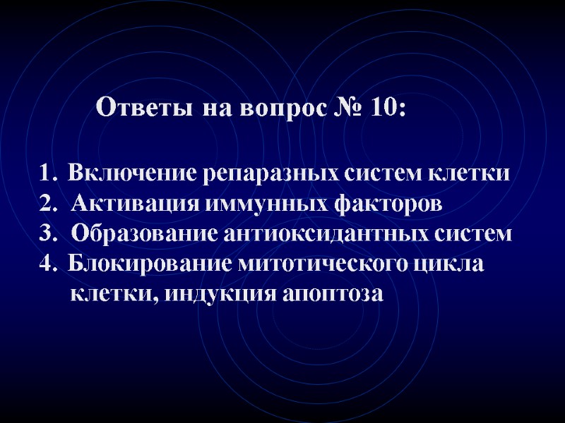 Ответы на вопрос № 10: Включение репаразных систем клетки 2. Активация иммунных факторов 3. Образование антиоксидантных систем Блокирование митотического цикла клетки, индукция апоптоза