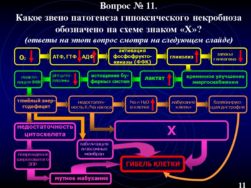 Вопрос № 11. Какое звено патогенеза гипоксического некробиоза обозначено на схеме знаком «Х»? (ответы на этот вопрос смотри на следующем слайде) 11 О2 АТФ, ГТФ АДФ активация фосфофрукто- киназы (ФФК) гликолиз запасы гликогена временное улучшение энергоснабжения лактат истощение бу- ферных систем рН цито- плазмы инакти- вация ФФК тяжёлый энер- годефицит недостаточ- ность K/Na насоса Na и H2O в клетке набухание клетки баллонирую- щая дистрофия недостаточность цитоскелета повреждение шероховатого ЭПР мутное набухание Х ГИБЕЛЬ КЛЕТКИ лабилизация лизосомных мембран