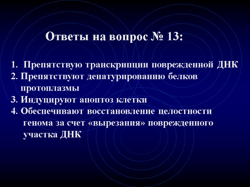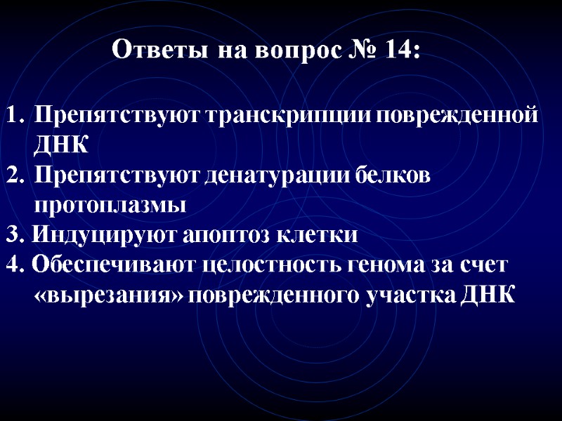 Ответы на вопрос № 13: Препятствую транскрипции поврежденной ДНК 2. Препятствуют денатурированию белков протоплазмы 3. Индуцируют апоптоз клетки 4. Обеспечивают восстановление целостности генома за счет «вырезания» поврежденного участка ДНК