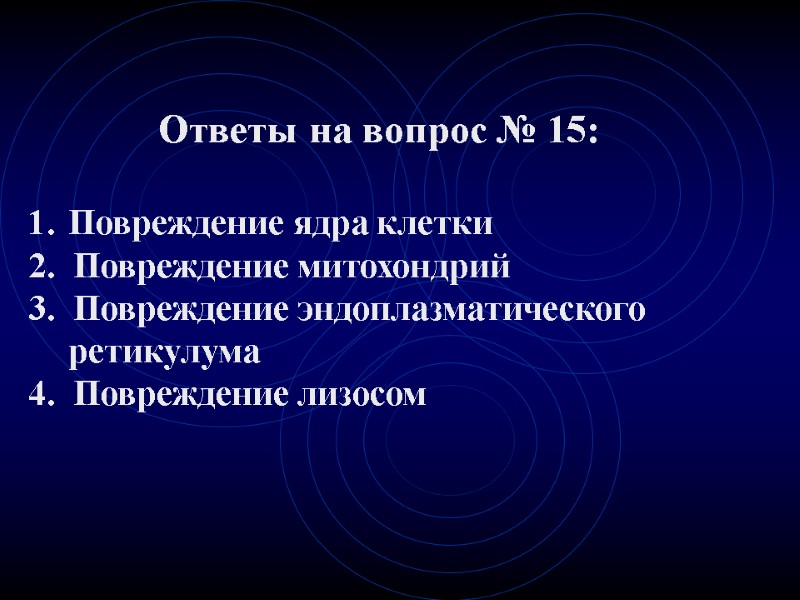 Ответы на вопрос № 15: Повреждение ядра клетки 2. Повреждение митохондрий 3. Повреждение эндоплазматического ретикулума 4. Повреждение лизосом