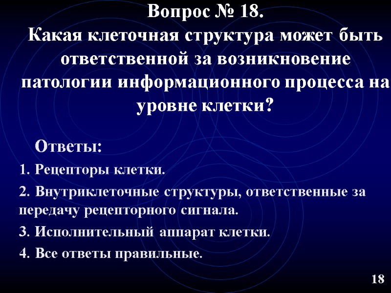 Вопрос № 18. Какая клеточная структура может быть ответственной за возникновение патологии информационного процесса на уровне клетки? Ответы: 1. Рецепторы клетки. 2. Внутриклеточные структуры, ответственные за передачу рецепторного сигнала. 3. Исполнительный аппарат клетки. 4. Все ответы правильные. 18
