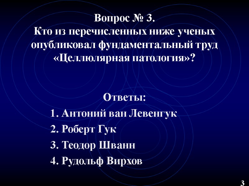 Вопрос № 2. Кто из перечисленных ниже ученых впервые увидел клетку и ввел этот термин в биологию и медицину? Ответы: 1. Антоний ван Левенгук 2. Роберт Гук 3. Рудольф Вирхов 4. Теодор Шванн 2