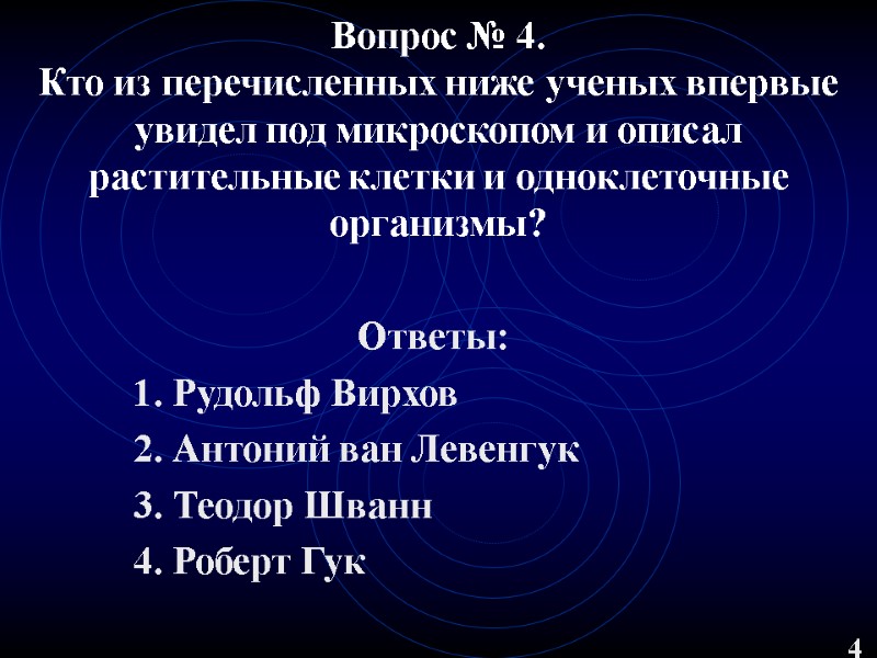 Вопрос № 4. Кто из перечисленных ниже ученых впервые увидел под микроскопом и описал растительные клетки и одноклеточные организмы? Ответы: 1. Рудольф Вирхов 2. Антоний ван Левенгук 3. Теодор Шванн 4. Роберт Гук 4
