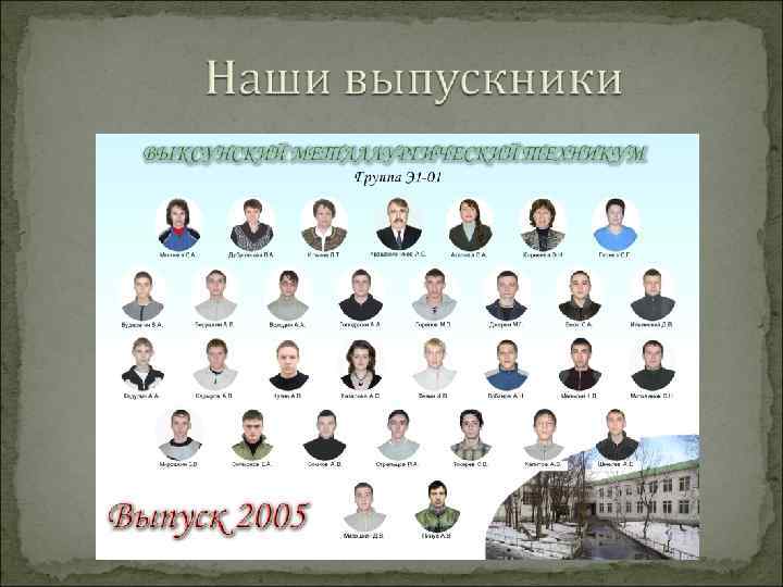 Выпускники Количество студентов закончивших Выксунский Металлургический техникум с квалификацией «электромонтёр электрического оборудования» с 1956 года по 2009 год составляет 2000 человек