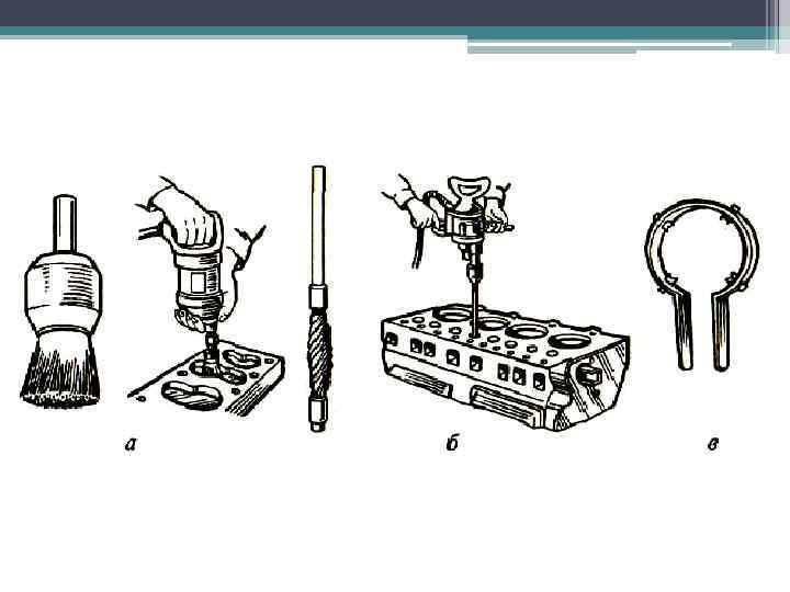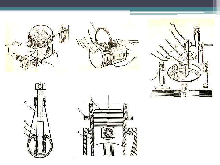 Ремонт цилиндропоршневой группы Основными дефектами цилиндропоршневой группы (ЦПГ) являются: - износ и задиры поверхности гильз цилиндров и поршней, - износ канавок под поршневые кольца, - износ и повреждение поршневых колец. Для замены ЦПГ двигатель обычно снимают с машины. Затем с него снимают головку цилиндров, поддон картера двигателя, маслопроводы и масляный насос. Поршни в сборе с шатунами выталкивают деревянной выколоткой. Обязательно проверяют выступание торца буртика гильзы над поверхностью блока. Неисправные гильзы выпрессовывают при помощи съемника. Поршневые кольца заменяют, если зазор в замке кольца больше допустимого. Для снятия и установки поршневых колец используют специальные щипцы.