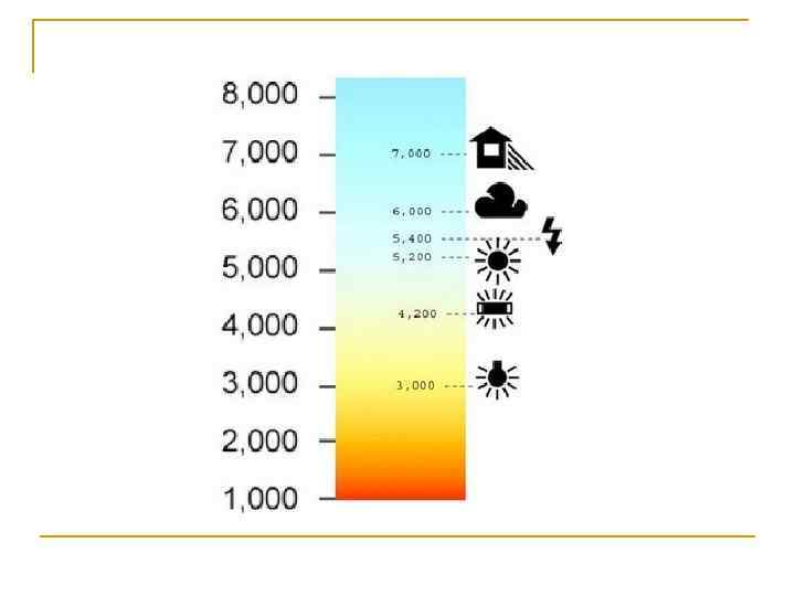 Баланс белого (WB) n n n n n Свеча - 1200 -1800 К Лампа накаливания - 2500 -3500 К Свет в сумерках - 4000 К Флуоресцентная лампа - 4000 -4800 К Яркий солнечный свет - 4800 -5400 К Фотовспышка - 5400 -5600 К Облачная пасмурная погода - 5400 -6200 К Тень или вечернее время - 8000 -9500 К Небо в яркий солнечный день - 7000 -11000 К