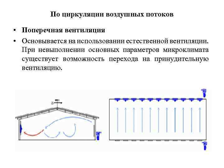 По циркуляции воздушных потоков • Поперечная вентиляция • Основывается на использовании естественной вентиляции. При невыполнении основных параметров микроклимата существует возможность перехода на принудительную вентиляцию.