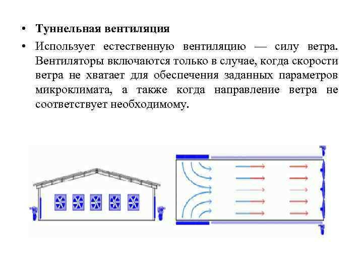 • Туннельная вентиляция • Использует естественную вентиляцию — силу ветра. Вентиляторы включаются только в случае, когда скорости ветра не хватает для обеспечения заданных параметров микроклимата, а также когда направление ветра не соответствует необходимому.