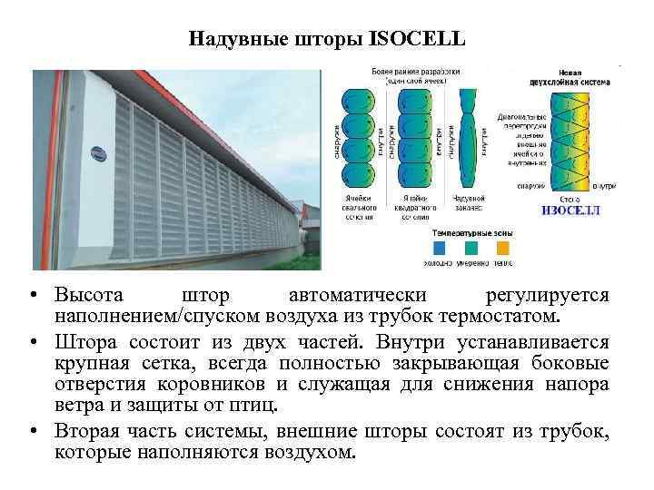Надувные шторы ISOCELL • Высота штор автоматически регулируется наполнением/спуском воздуха из трубок термостатом. • Штора состоит из двух частей. Внутри устанавливается крупная сетка, всегда полностью закрывающая боковые отверстия коровников и служащая для снижения напора ветра и защиты от птиц. • Вторая часть системы, внешние шторы состоят из трубок, которые наполняются воздухом.