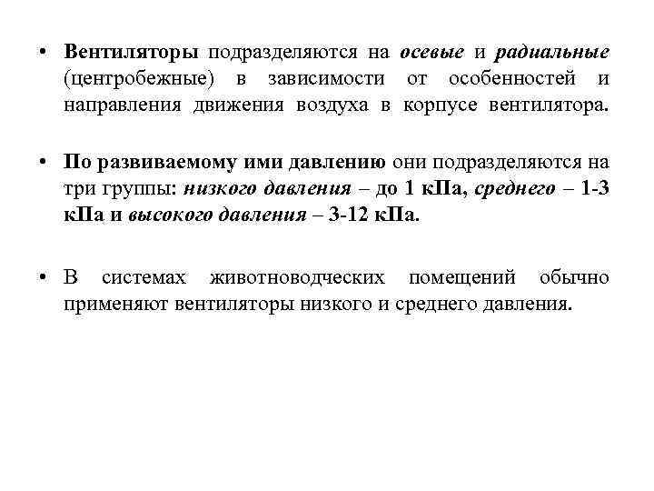 • Вентиляторы подразделяются на осевые и радиальные (центробежные) в зависимости от особенностей и направления движения воздуха в корпусе вентилятора. • По развиваемому ими давлению они подразделяются на три группы: низкого давления – до 1 к. Па, среднего – 1 -3 к. Па и высокого давления – 3 -12 к. Па. • В системах животноводческих помещений обычно применяют вентиляторы низкого и среднего давления.