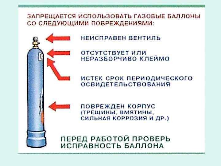 Перед началом газовой сварки и резки следует произвести проверку: а) плотности и прочности присоединения газовых шлангов к горелке (резаку) и редукторам; б) наличия воды в затворе до уровня контрольного крана и плотности всех соединений в затворе на пропуск газа, а также плотности присоединения шланга к затвору. Разборку и ремонт вентилей баллонов должен производить завод (цех), наполняющий баллоны газом. В тех случаях, когда из-за неисправности вентилей баллонов газ не может быть использован, баллон подлежит отправке на завод (цех) - наполнитель с надписью мелом: "Осторожно", "Полный". Установка стоек с баллонами в проходах и проездах запрещается.