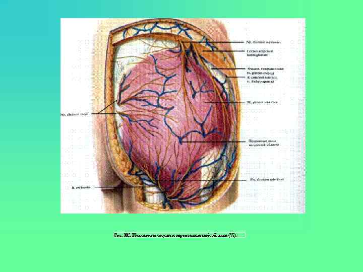 В подкожной жировой клетчатке ягодичной области с каждой стороны проходят 3 поверхностных нерва: 1. Nn. clunium superior (верхние ветви ягодицы) возникают из 3 верхних поясничных нервов. Прободают ягодичную фасцию на уровне подвздошного гребня, эти нервы спускаются в подкожной клетчатке. 2. Nn. clunium medii (средние ветви ягодицы) образуются из задних ветвей 3 верхних крестцовых нервов. Эти нервы проходят через ягодичную фасцию в медиальном отделе и направляются в подкожной клетчатке латерально. 3. Nn. clunium inferiores ответвляются от заднего кожного нерва бедра. Ветви указанных нервов перфорируют ягодичную фасцию в нижнем отделе области и в подкожной клетчатке распространяются в восходящем отделе.