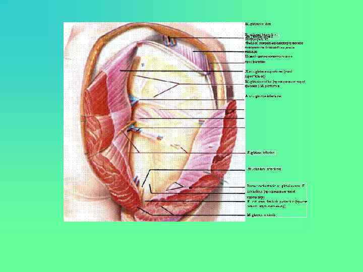 Ягодичная фасция (fascia glutea) распространяется на всю область. Вверху переходит в fascia lumbodorsalis, внизу и кнаружи продолжается в fascia lata. Ягодичная область имеет 2 листка – поверхностный и глубокий. Эти фасциальные листки соприкасаются с 3 слоями мышц: 1. К мышцам первого слоя относятся большая и средняя ягодичные мышцы. 2. Мышцы второго слоя: грушевидная, внутренняя запирательная, верхняя и нижняя близнецовые мышцы, квадратная мышца. 3. Третий слой представлен малой ягодичной и наружной запирательной мышцей.