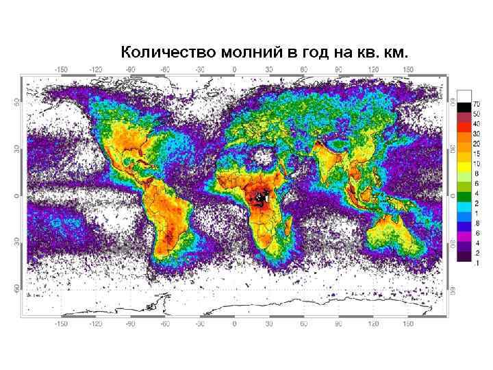 Интенсивность грозовой деятельности характеризуют числом грозовых дней в году nд либо числом грозовых часов в году nч. Число грозовых дней в году определяется по данным метеорологических станций. В настоящее время построена подробная карта грозовой деятельности на европейской части России. Число грозовых дней в году в средней полосе России – 20, в пустынях и в тундрах – 5, в южных районах – до 35, в тропических (некоторые районы Африки) – от 100 до 140. Средняя продолжительность грозы составляет 1, 5 часа. Продолжительность гроз в течение года определяет количество разрядов молнии в единицу поверхности земли. В России каждый квадратный километр поверхности поражается в среднем 2– 3 раза в год.