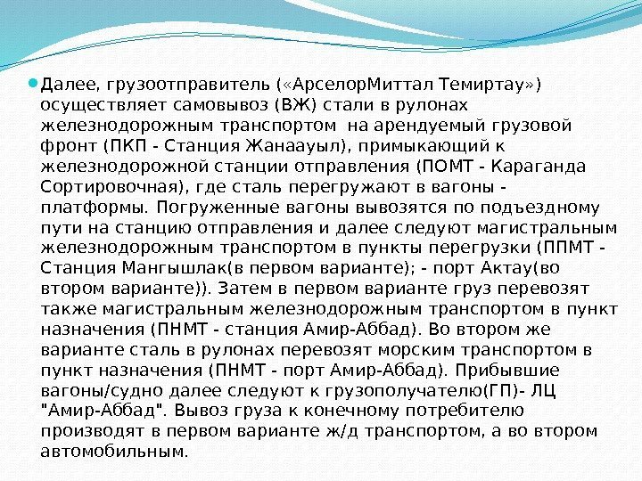 Далее, грузоотправитель ( «Арселор. Миттал Темиртау» ) осуществляет самовывоз (ВЖ) стали в рулонах железнодорожным транспортом на арендуемый грузовой фронт (ПКП — Станция Жанаауыл), примыкающий к железнодорожной станции отправления (ПОМТ — Караганда Сортировочная), где сталь перегружают в вагоны — платформы. Погруженные вагоны вывозятся по подъездному пути на станцию отправления и далее следуют магистральным железнодорожным транспортом в пункты перегрузки (ППМТ — Станция Мангышлак(в первом варианте); — порт Актау(во втором варианте)). Затем в первом варианте груз перевозят также магистральным железнодорожным транспортом в пункт назначения (ПНМТ — станция Амир-Аббад). Во втором же варианте сталь в рулонах перевозят морским транспортом в пункт назначения (ПНМТ — порт Амир-Аббад). Прибывшие вагоны/судно далее следуют к грузополучателю(ГП)- ЛЦ «Амир-Аббад». Вывоз груза к конечному потребителю производят в первом варианте ж/д транспортом, а во втором автомобильным.