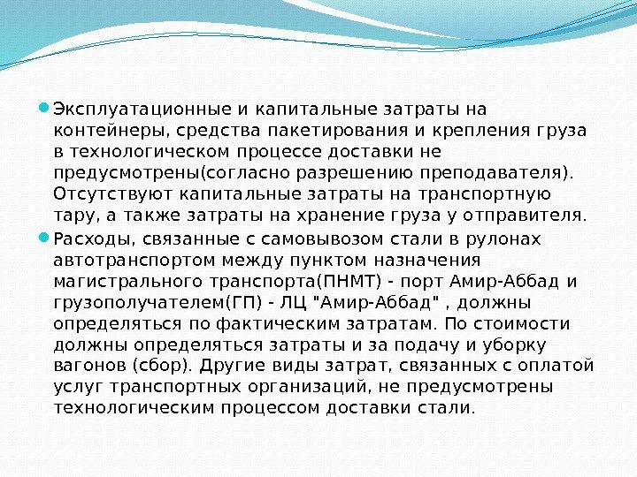 Эксплуатационные и капитальные затраты на контейнеры, средства пакетирования и крепления груза в технологическом процессе доставки не предусмотрены(согласно разрешению преподавателя). Отсутствуют капитальные затраты на транспортную тару, а также затраты на хранение груза у отправителя. Расходы, связанные с самовывозом стали в рулонах автотранспортом между пунктом назначения магистрального транспорта(ПНМТ) — порт Амир-Аббад и грузополучателем(ГП) — ЛЦ «Амир-Аббад» , должны определяться по фактическим затратам. По стоимости должны определяться затраты и за подачу и уборку вагонов (сбор). Другие виды затрат, связанных с оплатой услуг транспортных организаций, не предусмотрены технологическим процессом доставки стали.