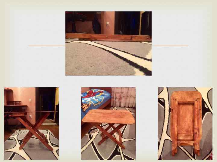 5 Нужно сделать 4 такие ножки. 6 Для столешницы нужна фанера « 600: 400 мм. и толщиной 4 -6 мм. » Ножовка , линейка. Обработать все стороны Шлифовальная колодка. В каждом углу начертить квадрат « 70: 70» и циркулем сделать круг (проделать действие с каждой стороны ). Циркуль , линейка , угольник. Закруглить края вырезав их лобзиком и закруглив шлифовальной колодкой. Лобзик , колодка шлифовальная. 7 8 9 10 Нужно сделать две поперечины одна размером « »