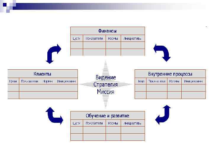 Сбалансированная Система Показателей (Balanced Scorecard) – наиболее популярная, признанная в мире концепция управления реализацией стратегии, разработанная профессорами Гарвардского университета Д. Нортоном и Р. Капланом (США). Роберт Каплан и Дейвид Нортон определили четыре перспективы, являющиеся основными группами стратегических целей, достижение которых оценивается ключевыми показателями: n Финансовая: Какую ценность мы представляем для наших акционеров? n Клиентская: Какую ценность мы представляем для наших клиентов? n Внутренних процессов: Какие процессы мы должны усовершенствовать, чтобы обеспечить конкурентоспособность предприятия? n Обучения и развития: Имеются ли программы развития, мотивации и роста?