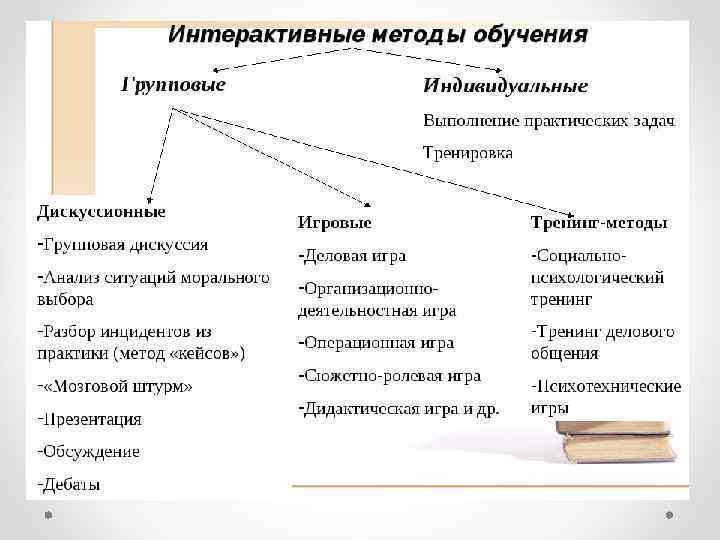 Понятие активных и пассивных методов обучения: 1. освоение материала учеником происходит только со слов учителя, а также материала, данного в учебниках. Ученики являются пассивными слушателями. Связь учащихся с учителем осуществляется посредством контрольных или самостоятельных работ, тестов, а также опросов. Примером являются уроки, проводимые в виде лекций. Присущ авторитарный стиль.