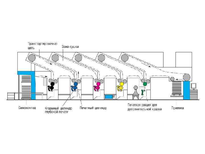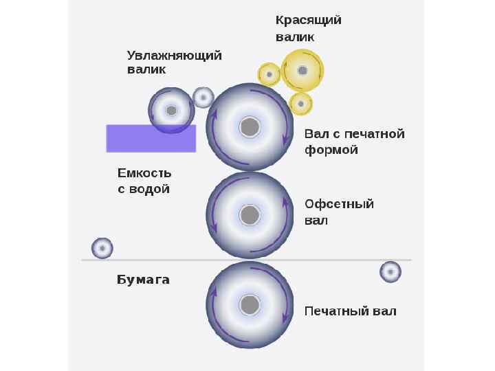 Особенности плоской печати • Равномерное нанесение краски обеспечивает одинаковую насыщенность печатных элементов на продукции. • Многоцветные полутоновые изображения воспроизводятся обычно в четыре краски (желтой, пурпурной, голубой и черной). Эти краски в средних тонах выделяются как отдельные пятнышки, частично друга перекрывая. • На оборотной стороне продукции не возникает рельефа. • Очень тонкие линии на оттиске получаются неровными и разрывными.