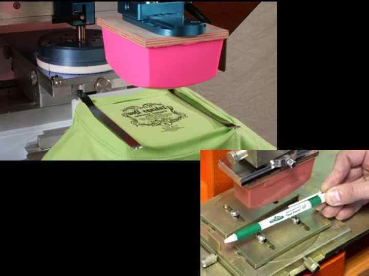 • Эластичный промежуточный элемент, переносящий изображение (называемый «тампоном» или «роллером» ), позволяет переносить изображение с печатных форм глубокой, плоской, высокой и трафаретной печати на поверхности практически любой формы. Чаще всего используют печатную форму с углублёнными элементами изображения на плоской пластине.