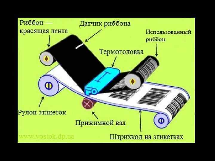 Термотрансферная печать • способ печати, при котором термоголовка принтера нагревает риббон, то есть красящую термотрансферную ленту, при этом красящий слой переносится на термотрансферную этикетку с термотрансферной ленты.