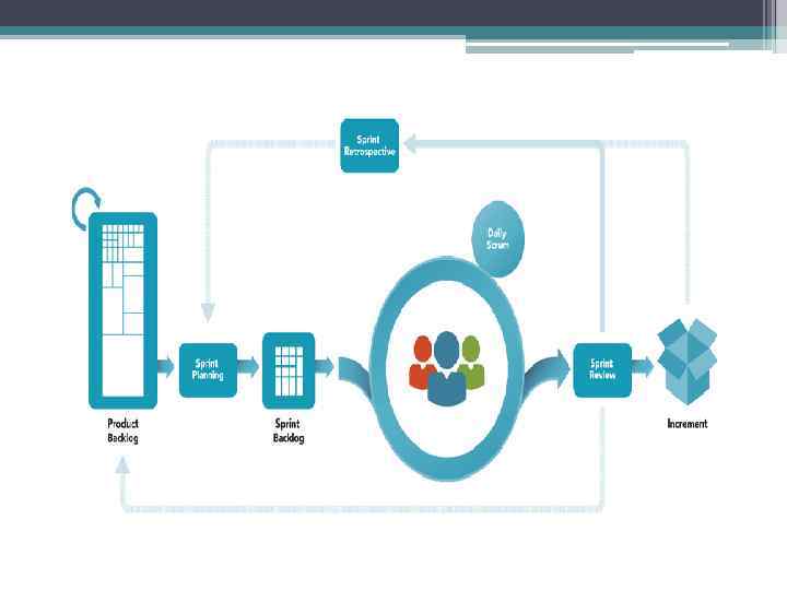Роли в Scrum • Product owner (PO) является связующим звеном между командой разработки и заказчиком. Задача PO — максимальное увеличение ценности разрабатываемого продукта и работы команды. • Scrum master (SM) является «служащим лидером» (англ. servant-leader). Задача Scrum Master — помочь команде максимизировать ее эффективность посредством устранения препятствий, помощи, обучении и мотивации команде, помощи PO • Команда разработки (Development team, DT) состоит из специалистов, производящих непосредственную работу над производимым продуктом.