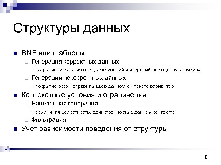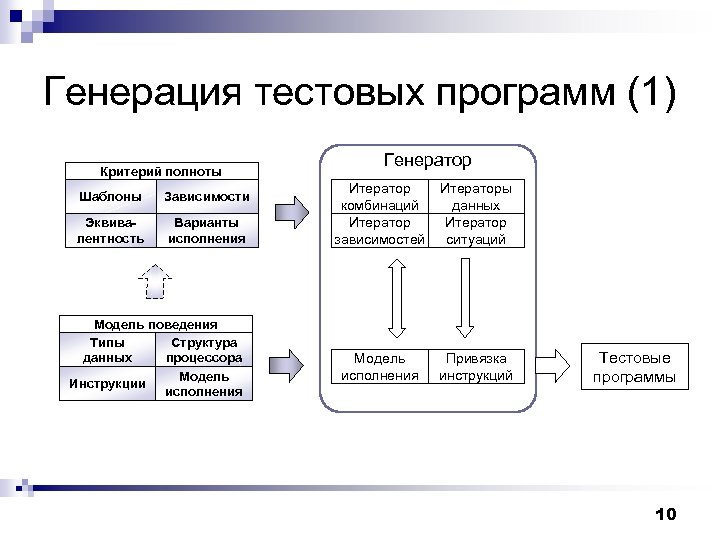 Структуры данных n BNF или шаблоны ¨ Генерация корректных данных – покрытие всех вариантов, комбинаций и итераций на заданную глубину ¨ Генерация некорректных данных – покрытие всех неправильных в данном контексте вариантов n Контекстные условия и ограничения ¨ Нацеленная генерация – ссылочная целостность, единственность в данном контексте ¨ n Фильтрация Учет зависимости поведения от структуры 9