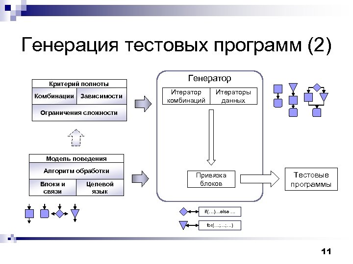 Генерация тестовых программ (1) Критерий полноты Шаблоны Зависимости Эквивалентность Варианты исполнения Модель поведения Типы Структура данных процессора Модель Инструкции исполнения Генератор Итератор комбинаций Итератор зависимостей Итераторы данных Итератор ситуаций Модель исполнения Привязка инструкций Тестовые программы 10