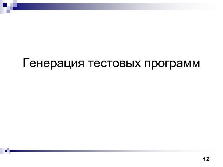 Генерация тестовых программ (2) Критерий полноты Комбинации Зависимости Генератор Итератор комбинаций Итераторы данных Ограничения сложности Модель поведения Алгоритм обработки Блоки и связи Целевой язык Привязка блоков Тестовые программы if(…)…else … for(…; …; …) 11