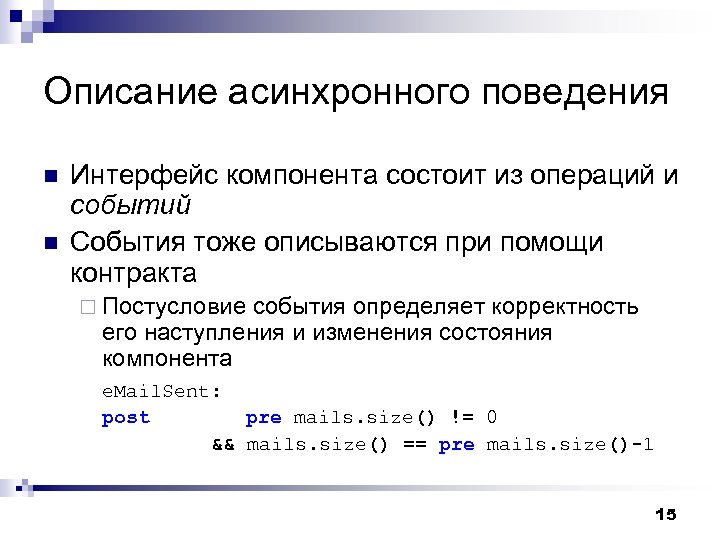 Описание асинхронного поведения n n Интерфейс компонента состоит из операций и событий События тоже описываются при помощи контракта ¨ Постусловие события определяет корректность его наступления и изменения состояния компонента e. Mail. Sent: post pre mails. size() != 0 && mails. size() == pre mails. size()-1 15