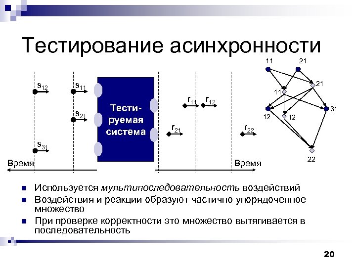 Тестирование асинхронности 11 s 12 21 s 11 s 21 21 Тестируемая система r 11 11 r 12 31 12 r 22 s 31 Время n n n Время 22 Используется мультипоследовательность воздействий Воздействия и реакции образуют частично упорядоченное множество При проверке корректности это множество вытягивается в последовательность 20