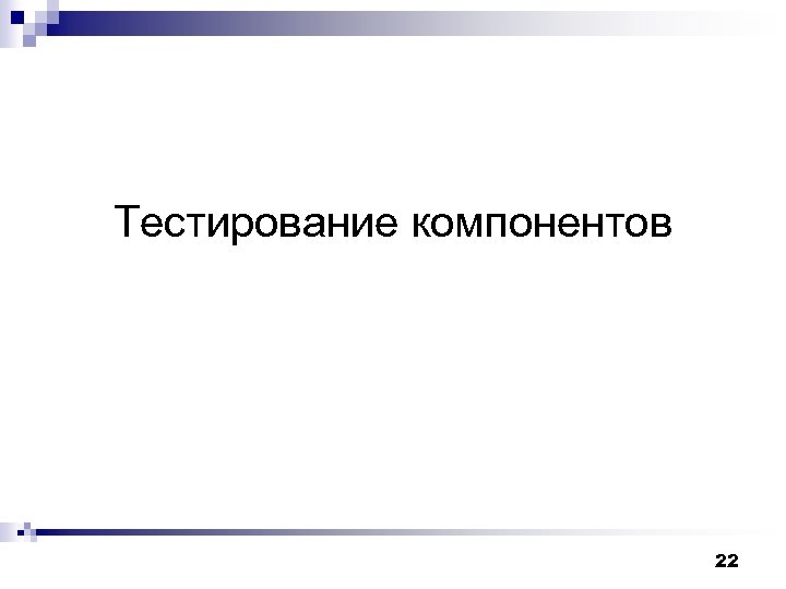 Тестирование компонентов Генератор Описание автомата Состояния Действия Критерий полноты Варианты исполнения Виды параметров Виды состояний Модель поведения Структуры Операции и данных события Пред- и Инварианты постусловия Обходчик автоматов Итераторы данных Метрика покрытия Генерация тестовой последовательности на лету Предусловия Тестируемая система Модель состояния Постусловия Оракулы 21