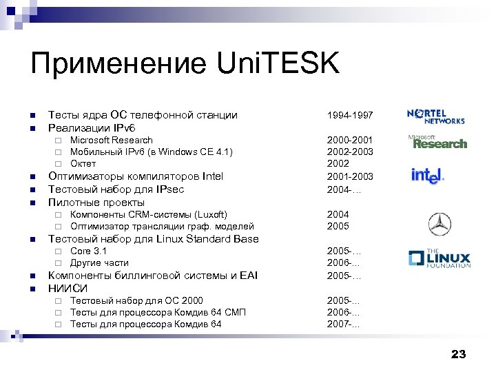Применение Uni. TESK n n Тесты ядра ОС телефонной станции Реализации IPv 6 ¨ ¨ ¨ n n n Оптимизаторы компиляторов Intel Тестовый набор для IPsec Пилотные проекты ¨ ¨ n n Компоненты CRM-системы (Luxoft) Оптимизатор трансляции граф. моделей 2000 -2001 2002 -2003 2002 2001 -2003 2004 -… 2004 2005 Тестовый набор для Linux Standard Base ¨ ¨ n Microsoft Research Мобильный IPv 6 (в Windows CE 4. 1) Октет 1994 -1997 Core 3. 1 Другие части Компоненты биллинговой системы и EAI НИИСИ ¨ ¨ ¨ Тестовый набор для ОС 2000 Тесты для процессора Комдив 64 СМП Тесты для процессора Комдив 64 2005 -… 2006 -. . . 2005 -… 2005 -. . . 2006 -. . . 2007 -. . . 23