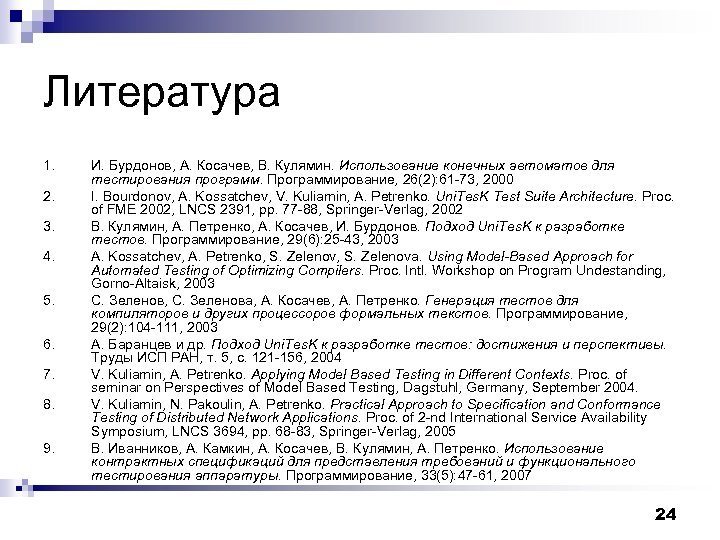 Литература 1. 2. 3. 4. 5. 6. 7. 8. 9. И. Бурдонов, А. Косачев, В. Кулямин. Использование конечных автоматов для тестирования программ. Программирование, 26(2): 61 -73, 2000 I. Bourdonov, A. Kossatchev, V. Kuliamin, A. Petrenko. Uni. Tes. K Test Suite Architecture. Proc. of FME 2002, LNCS 2391, pp. 77 -88, Springer-Verlag, 2002 В. Кулямин, А. Петренко, А. Косачев, И. Бурдонов. Подход Uni. Tes. K к разработке тестов. Программирование, 29(6): 25 -43, 2003 A. Kossatchev, A. Petrenko, S. Zelenova. Using Model-Based Approach for Automated Testing of Optimizing Compilers. Proc. Intl. Workshop on Program Undestanding, Gorno-Altaisk, 2003 С. Зеленов, С. Зеленова, А. Косачев, А. Петренко. Генерация тестов для компиляторов и других процессоров формальных текстов. Программирование, 29(2): 104 -111, 2003 А. Баранцев и др. Подход Uni. Tes. K к разработке тестов: достижения и перспективы. Труды ИСП РАН, т. 5, с. 121 -156, 2004 V. Kuliamin, A. Petrenko. Applying Model Based Testing in Different Contexts. Proc. of seminar on Perspectives of Model Based Testing, Dagstuhl, Germany, September 2004. V. Kuliamin, N. Pakoulin, A. Petrenko. Practical Approach to Specification and Conformance Testing of Distributed Network Applications. Proc. of 2 -nd International Service Availability Symposium, LNCS 3694, pp. 68 -83, Springer-Verlag, 2005 В. Иванников, А. Камкин, А. Косачев, В. Кулямин, А. Петренко. Использование контрактных спецификаций для представления требований и функционального тестирования аппаратуры. Программирование, 33(5): 47 -61, 2007 24