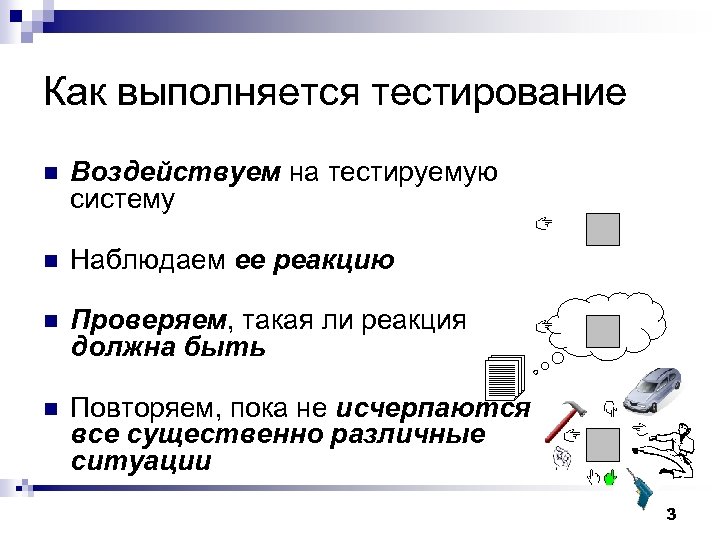 Что такое тестирование Оценка соответствия системы требованиям к ней на основе результатов наблюдения за ее работой в конечном наборе специально подготовленных ситуаций SWEBOK (2004), IEEE 610 (1991) n n Система в ходе тестирования должна работать Нужно готовить специальные (тестовые) ситуации Оценивается соответствие – ищем ошибки Нужна общая оценка – нужно подготовить конечный (небольшой) набор ситуаций, позволяющий ее дать 2