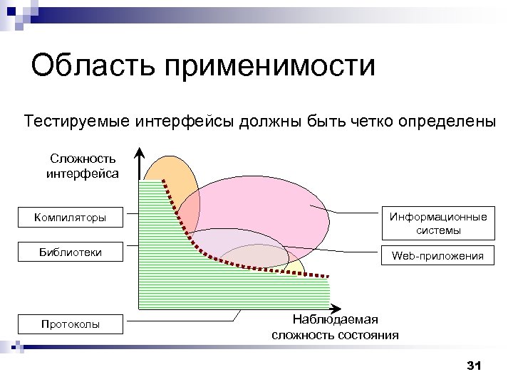 Область применимости Тестируемые интерфейсы должны быть четко определены Сложность интерфейса Компиляторы Информационные системы Библиотеки Web-приложения Протоколы Наблюдаемая сложность состояния 31