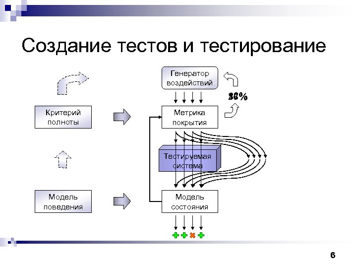 Создание тестов и тестирование Генератор воздействий 12% 36% 87% 57% Критерий полноты Метрика покрытия Тестируемая система Модель поведения Модель состояния + оракул 6