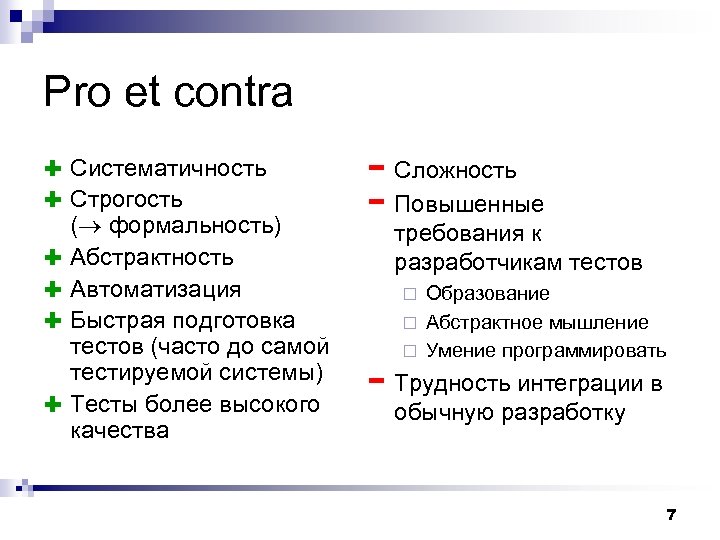 Pro et contra Ì Систематичность Ì Строгость Ì Ì ( формальность) Абстрактность Автоматизация Быстрая подготовка тестов (часто до самой тестируемой системы) Тесты более высокого качества − Сложность − Повышенные требования к разработчикам тестов Образование ¨ Абстрактное мышление ¨ Умение программировать ¨ − Трудность интеграции в обычную разработку 7