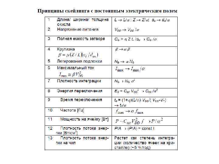 В соответствии с принципом масштабирования Деннарда все значения размеров и напряжений, включая пороговое напряжение, уменьшаются, а концентрация примеси увеличивается в одно и то же число ( ) раз. Тогда из соотношений электростатики следует, что распределение напряженности электрического поля (в новых координатах) будет таким же, как и в исходной приборной структуре с большими размерами. При масштабировании необходимо, чтобы при скейлинге не изменялись электрические характеристики ВАХ транзисторов. Для этого необходимо оставлять постоянными некоторые параметрические инварианты. Один из возможных таких инвариантов – электрические поля в транзисторе. Для того чтобы электрические поля внутри приборов оставались приблизительно постоянными, необходимо уменьшать напряжения питания. Красников Г. Я. Конструктивно-технологические особенности субмикронных МОП-транзисторов Издание 2 -е, исправленное Москва: Техносфера, 2011. - 800 с. , ISBN 978 -5 -94836 -289 -2 Зебрев Г. И. Физические основы кремниевой наноэлектроники: Учебное пособие. — М. : МИФИ, 2008. — 288 с.