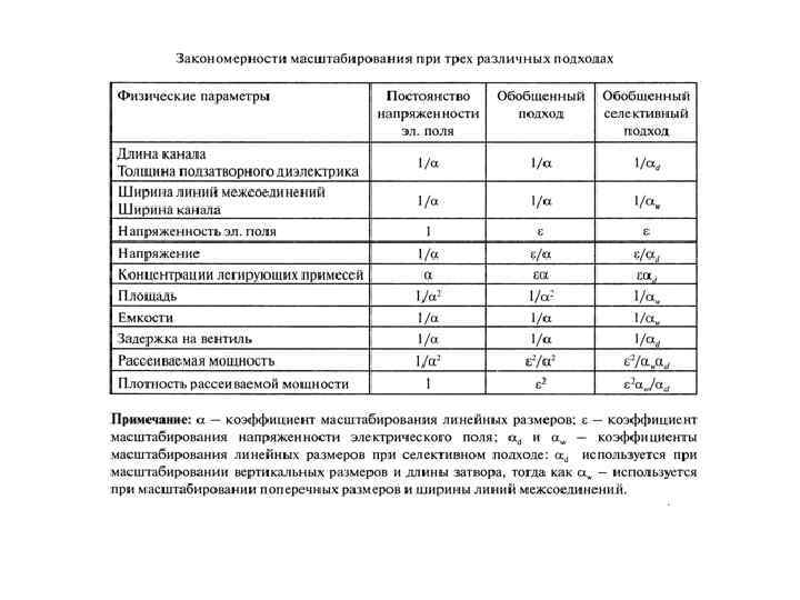 На «микроэлектронном этапе» развития КМДП технологии при пере ходе от одной ПТН к следующей придерживались, как правило, следующего принципа масштабирования: все размеры транзисторов уменьшались пропорционально уменьшению проектно-технологической нормы. Если ПТН уменьшалась, например, в к раз, то во столько же раз уменьшались длина и ширина транзисторов, и толщина подзатворного диэлектрика. Чтобы сохранить приблизительно те же самые значения напряженности электрического поля в элементах транзисторов, приходилось приблизительно: • в √ к раз уменьшать напряжение питания, • в к раз повышать уровень легирования подложки. Электрическая емкость затвора и другие паразитные емкости уменьшались при этом приблизительно в к раз. Соответственно примерно во столько же раз уменьшалось время переключения схемы и возрастала частота переключения (быстродействие) логических схем, в к 2 раз уменьшались затраты энергии на переключение и возрастала плотность интеграции.