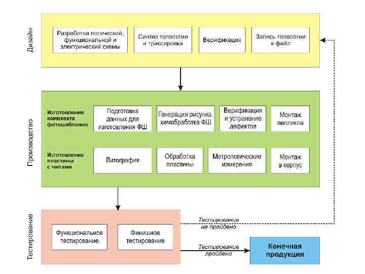 Стадии технологического маршрута. Технологический процесс (маршрут) изготовления интегральных схем ИС состоит из четырех стадий: Стадия 1. Изготовление кристаллов ИС на пластине, начинающаяся с запуска на маршрут исходной пластины и заканчивающаяся вскрытием контактных площадок в слое пассивации готовых кристаллов. Стадия 2. Функциональное тестирование кристаллов ИС на пластине с целью определения их годности по требуемым рабочим характеристикам, которое проводится с помощью тестера со специальным программным обеспечением. Стадия 3. Сборка кристаллов в корпус. Стадия 4. Функциональное тестирование корпусированной ИНС, устанавливаемой в специальном разъеме для подсоединения тестера. Стадии 2 и 4 являются контрольными для стадий 1 и 3 и показывают, что основной брак (≥ 98%) в производстве ИНС приходится на стадию изготовления кристаллов.